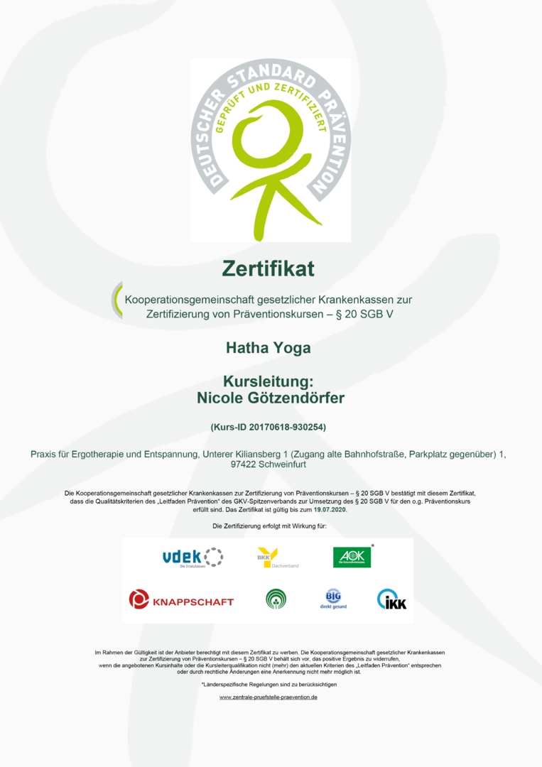Am Ende des Kurses erhalten Sie eine Bestätigung über die Kursteilnahme, die Sie bei Ihrer Krankenversicherung einreichen können. Bei einer Kursteilnahme von mind. 80% ist eine Kostenrückerstattung möglich. Bitte erfragen Sie dies vorab bei Ihrer Krankenkasse.